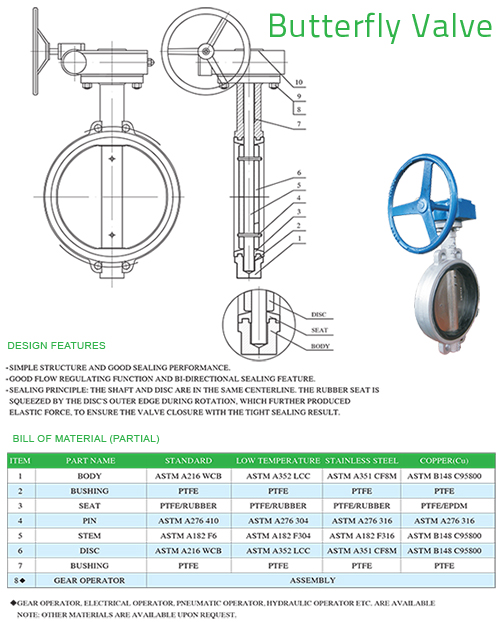 Product Details Flanged Soft Seated Design and Manufactur MSS SP-67, MSS SP-68, BS 5155 Face to Face Dimension BS 5155 Flange Connection Dimension ASME B16.5, ASME B16.47 BW Connection Dimension ASME B16.25 Pressure-Temperature Ratings ASME B16.34 Test and Inspection API 598 Type of Operation Manual, Gear, Electric, Pneumatic NPS 2"~80" Class 150lb~600lb Main Material WCB, WCC, LCB, LCC, CF8, CF8M, CF3, CF3M, CF8C, CN7M - Wafer Butterfly
